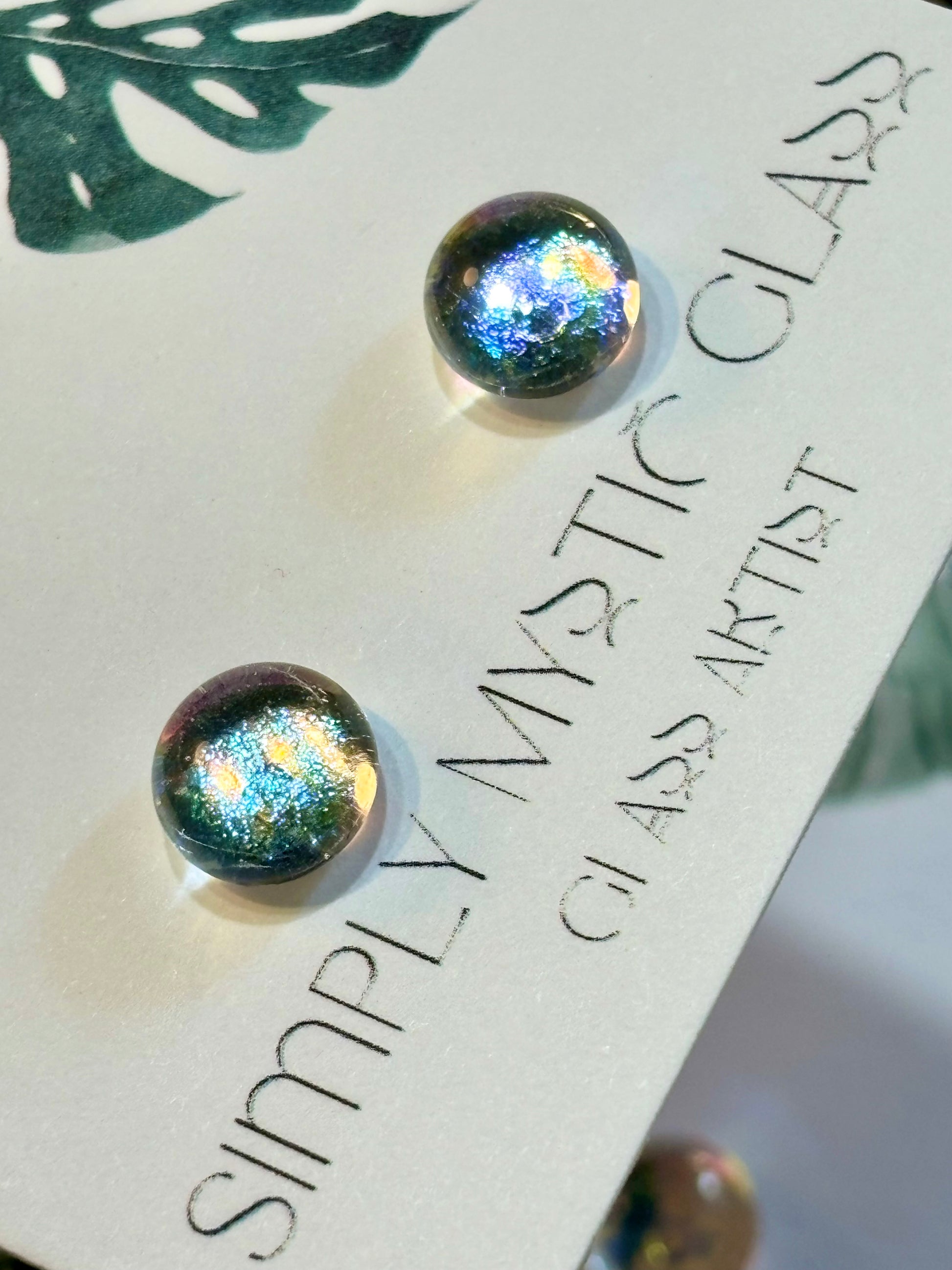 Adorable small dichroic glass earrings. Colorful rainbow shine.