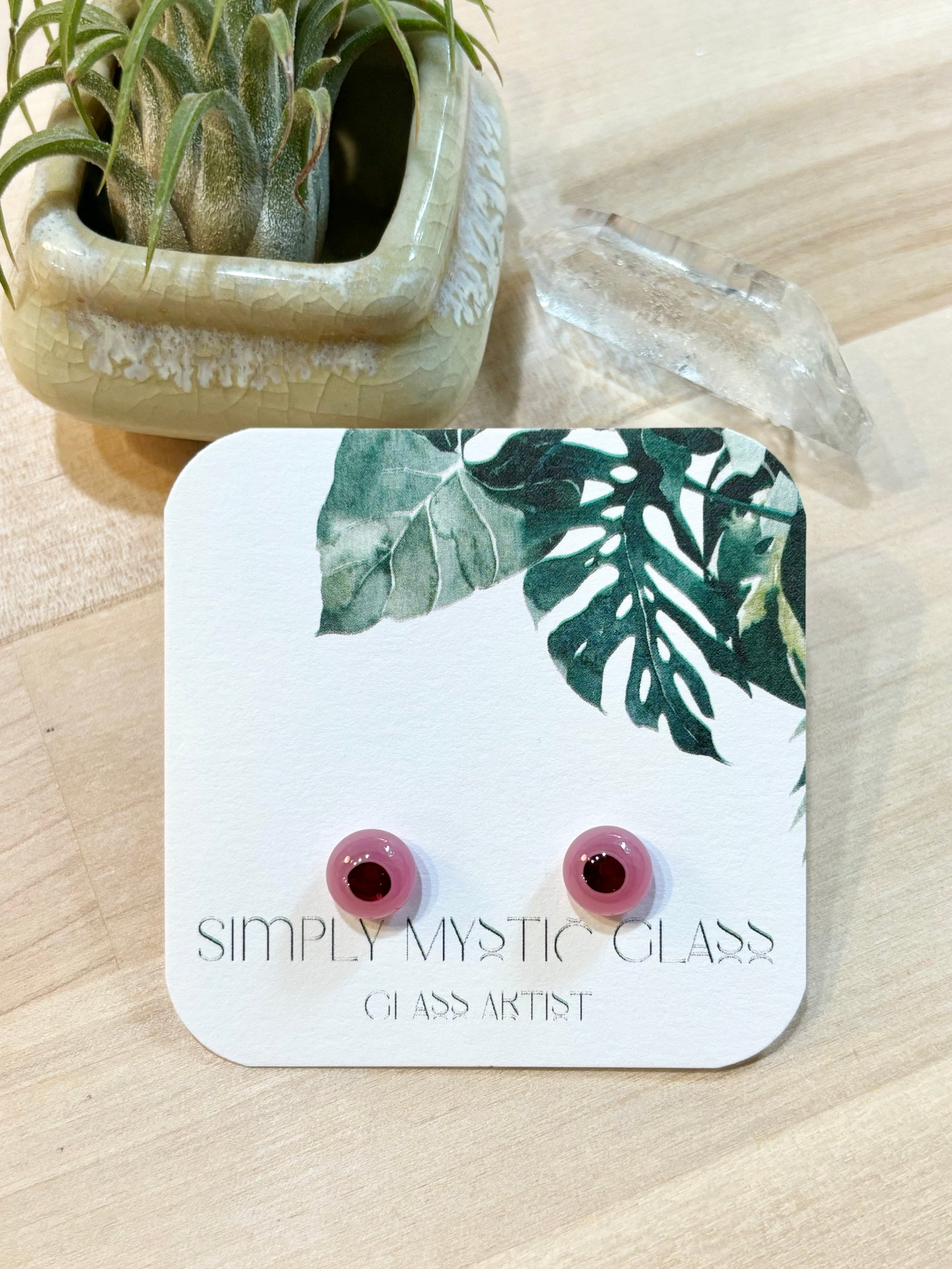 Gorgeous light pink glass stud earrings with a beautiful magenta center.