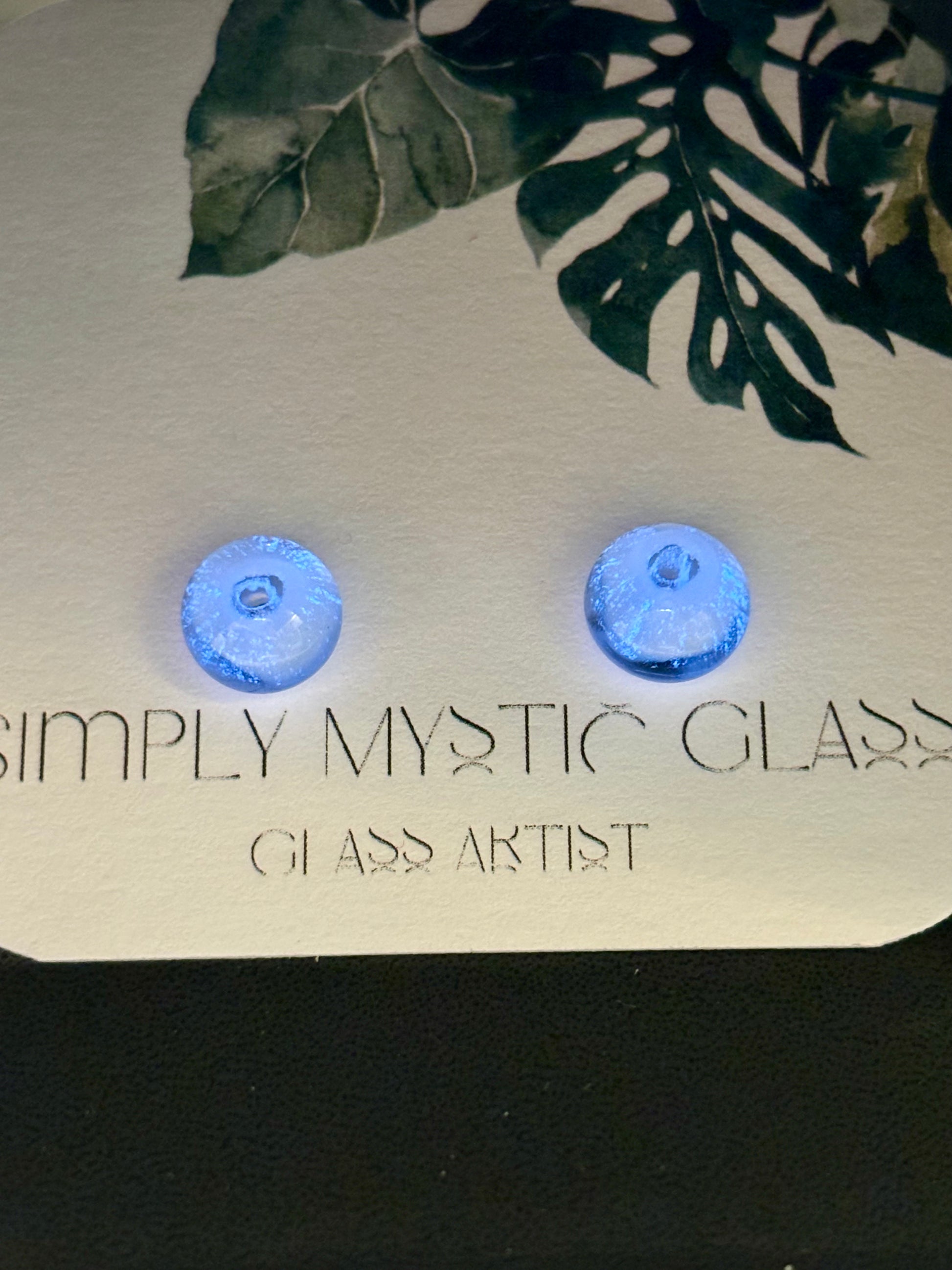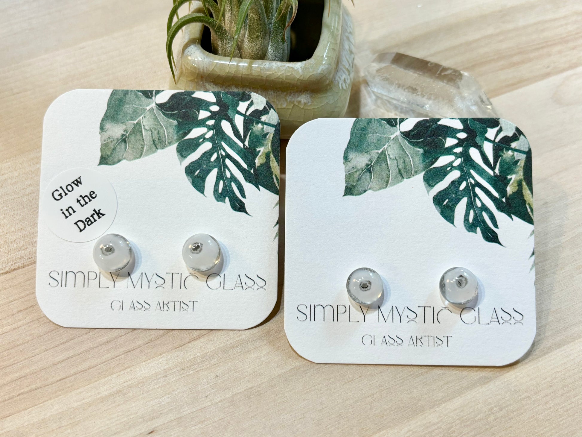 Beautiful white and clear glass stud earrings. Glows blue in the dark.