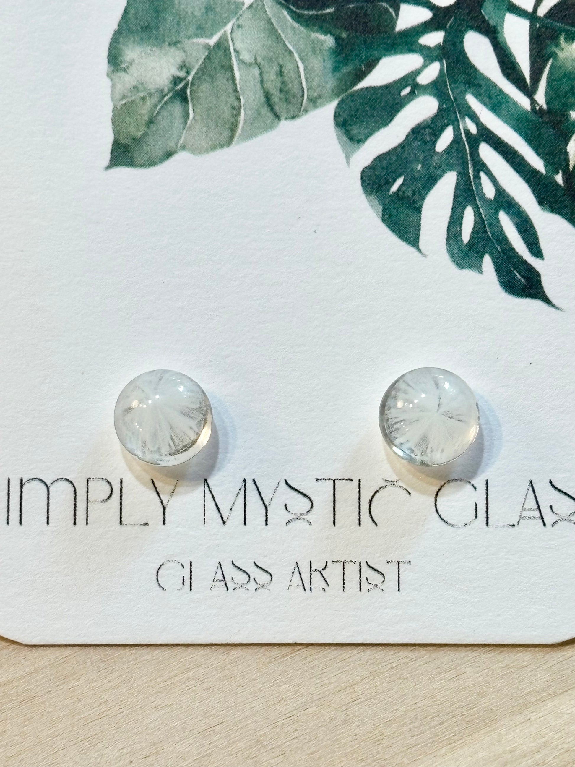 Beautiful white and clear glow in the dark glass stud earrings. Glows green in the dark.