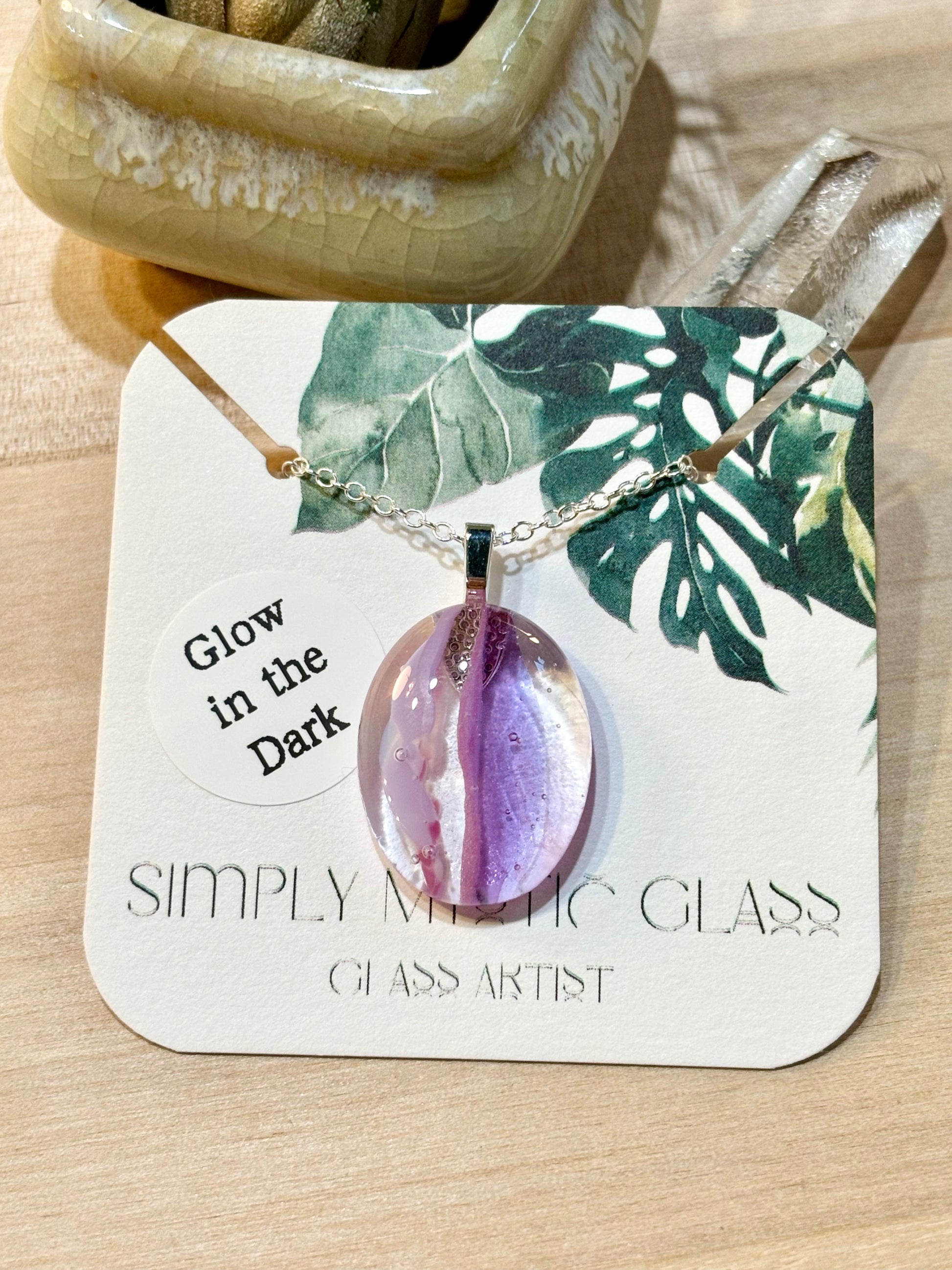 Stunning shades of pink and clear glass necklace. Glows purple in the dark.