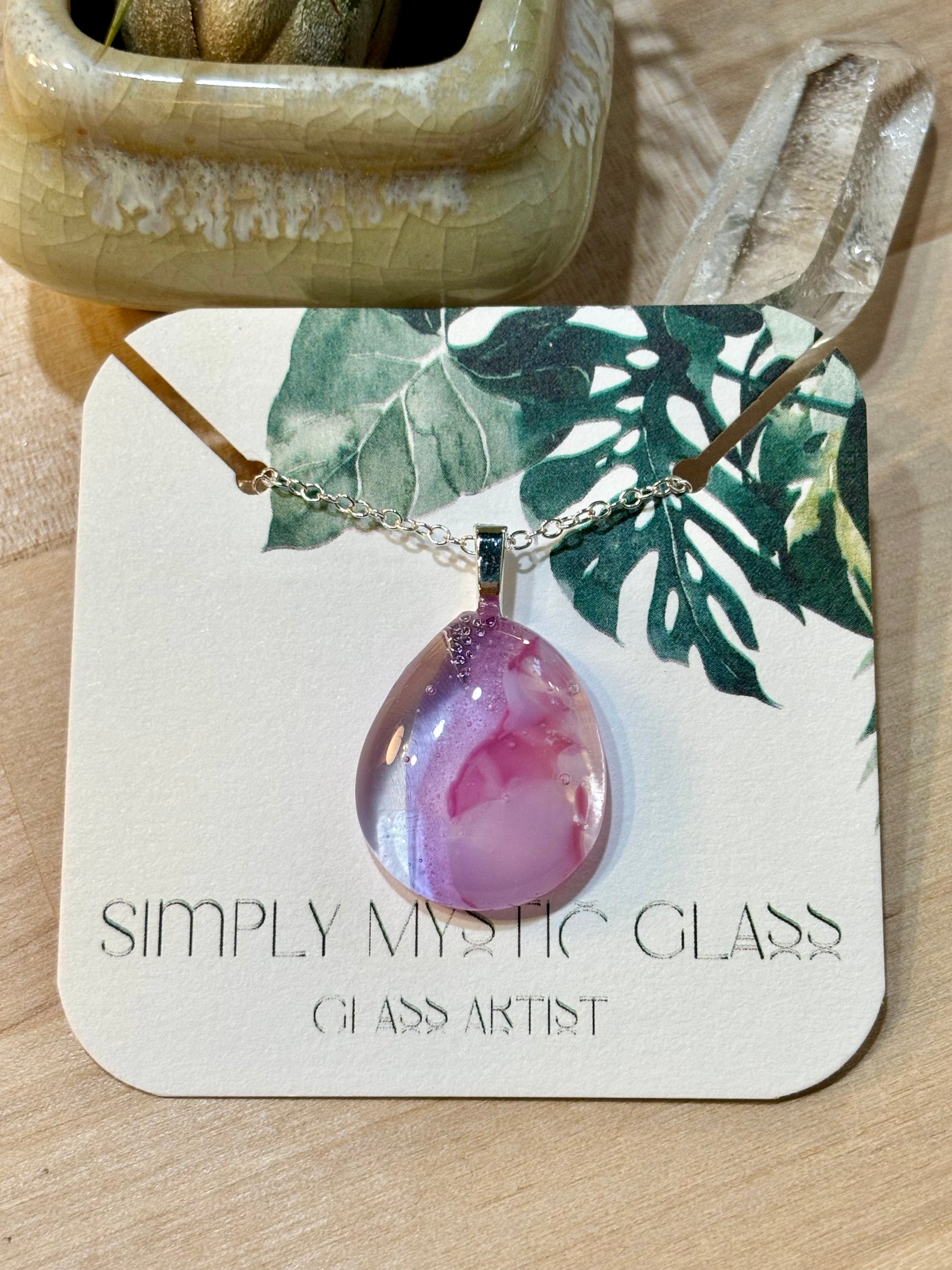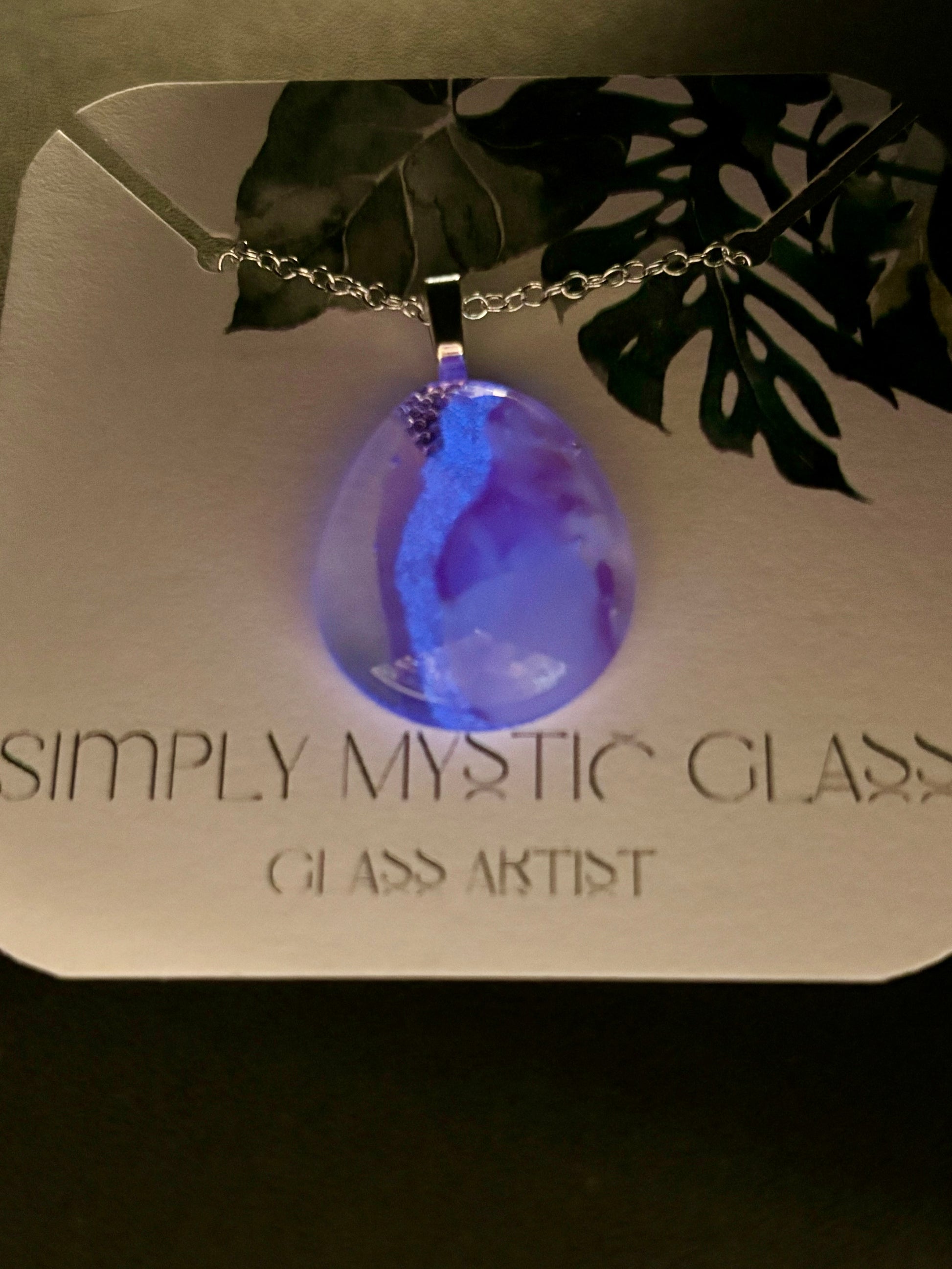 Stunning shades of pink and clear glass necklace. Glows purple in the dark.
