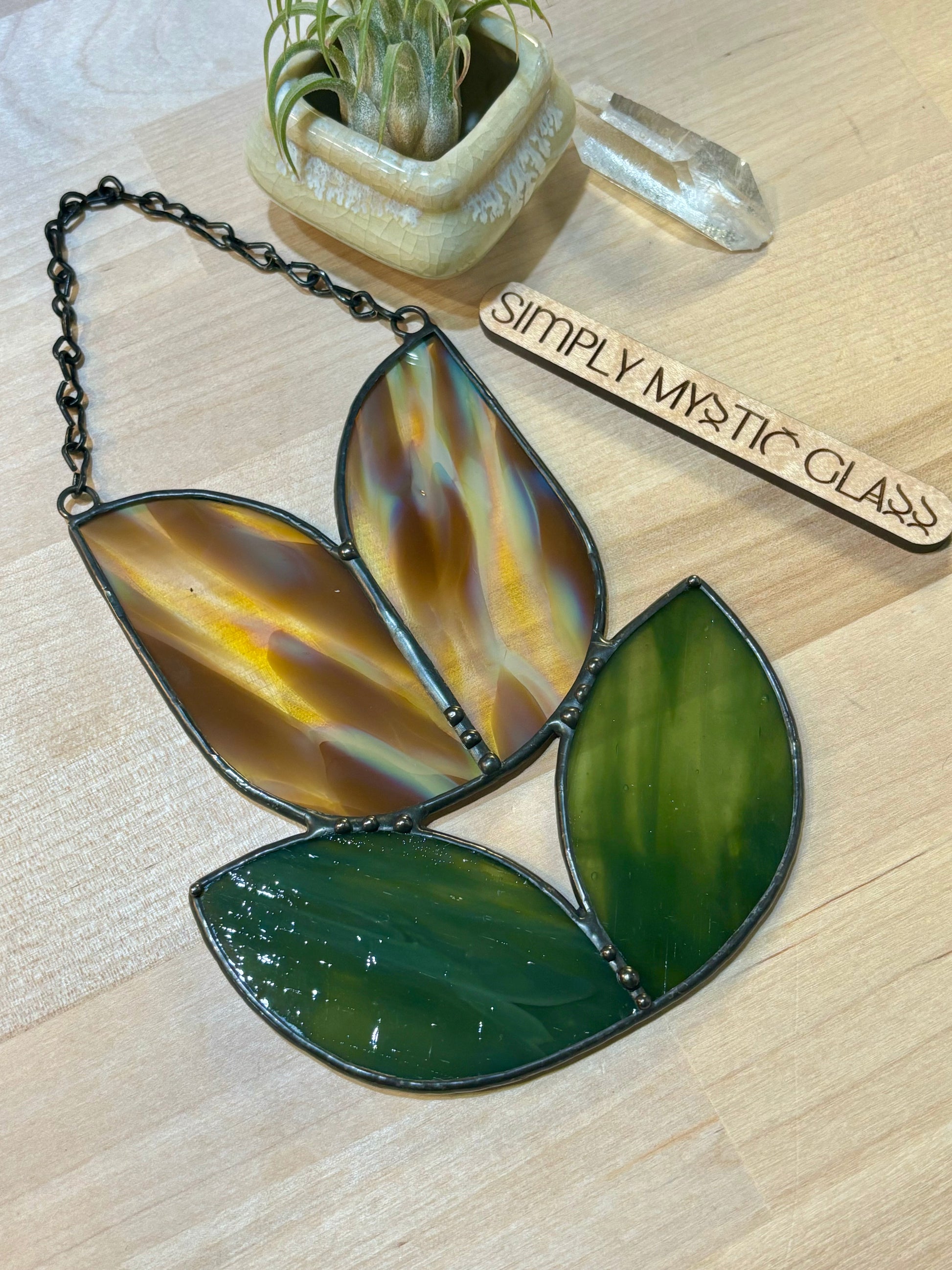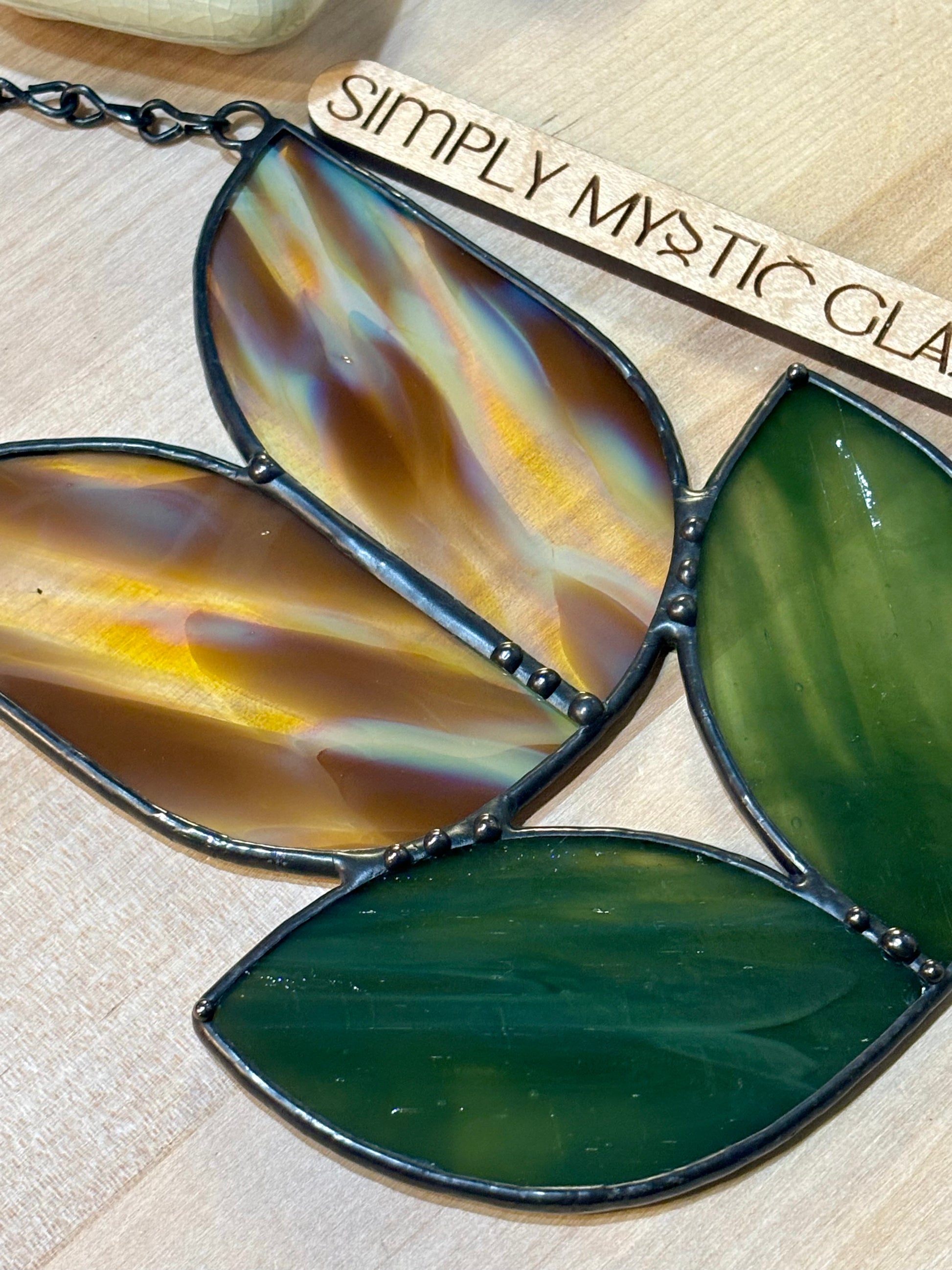 Retro style stained glass flower. Beautiful yellows and brown glass from Fremont Antique Glass.