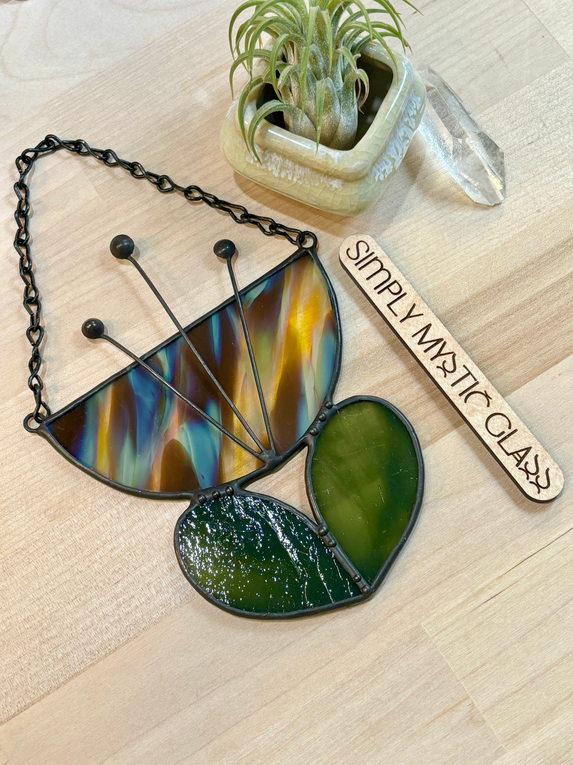 Retro style flower stained glass. The beautiful brown, cream and yellow glass is from Fremont Antique Glass.