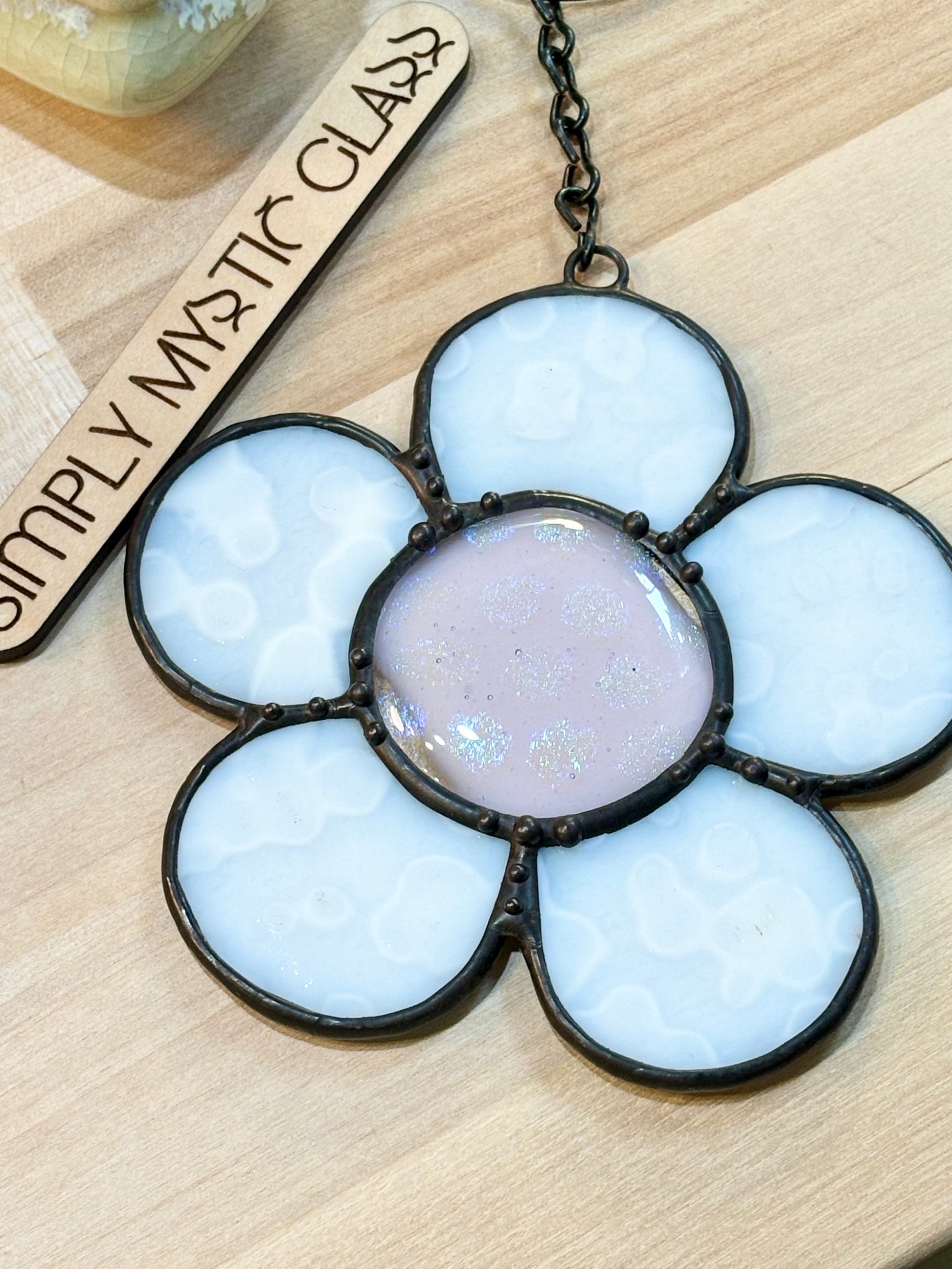 Add a little flower power to your life with this white stained glass flower. Pink and dichroic glass center.