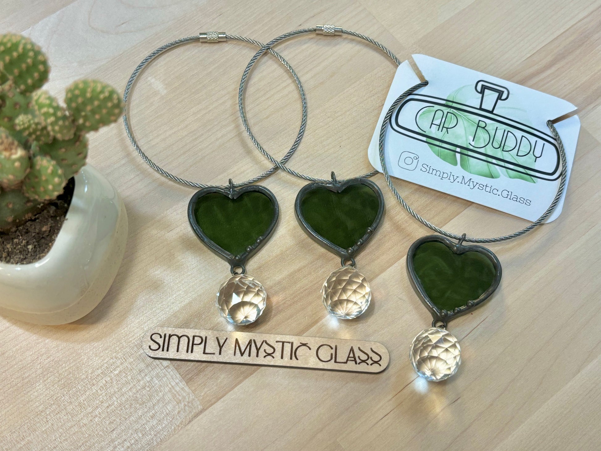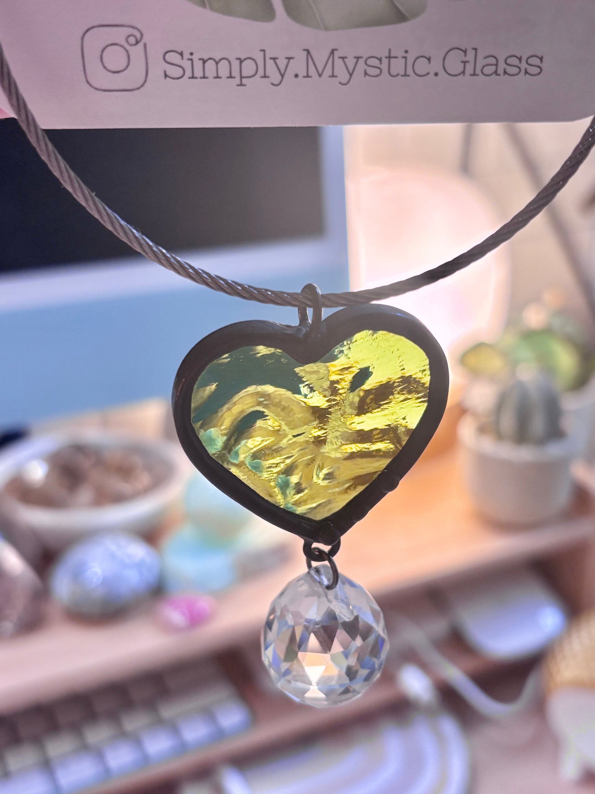 Enjoy stained glass even in your car! Just untwist the cable, wrap around your cars rear view mirror and secure the cable. Now you have a beautiful stained glass piece and a glass crystal in your car.