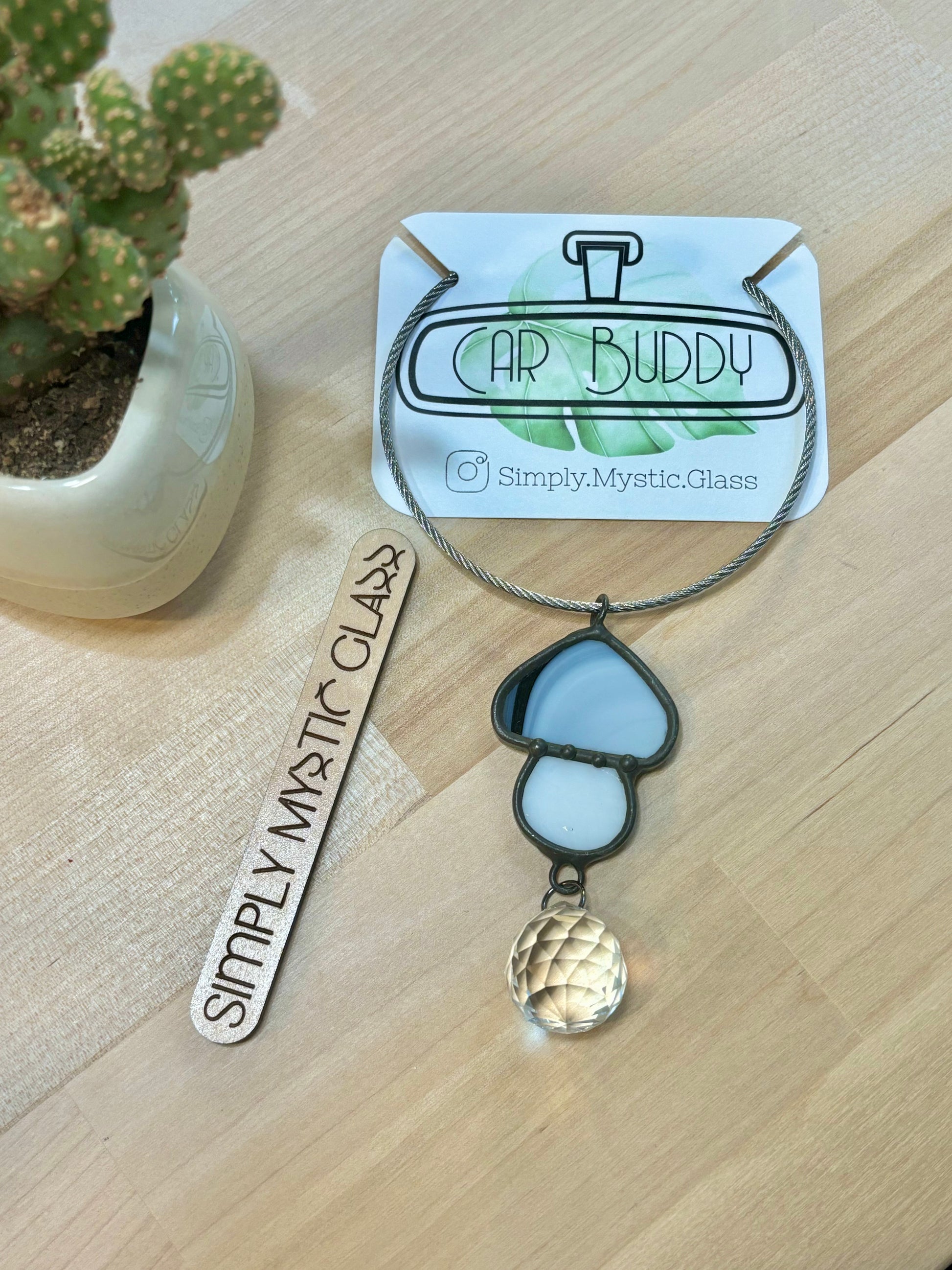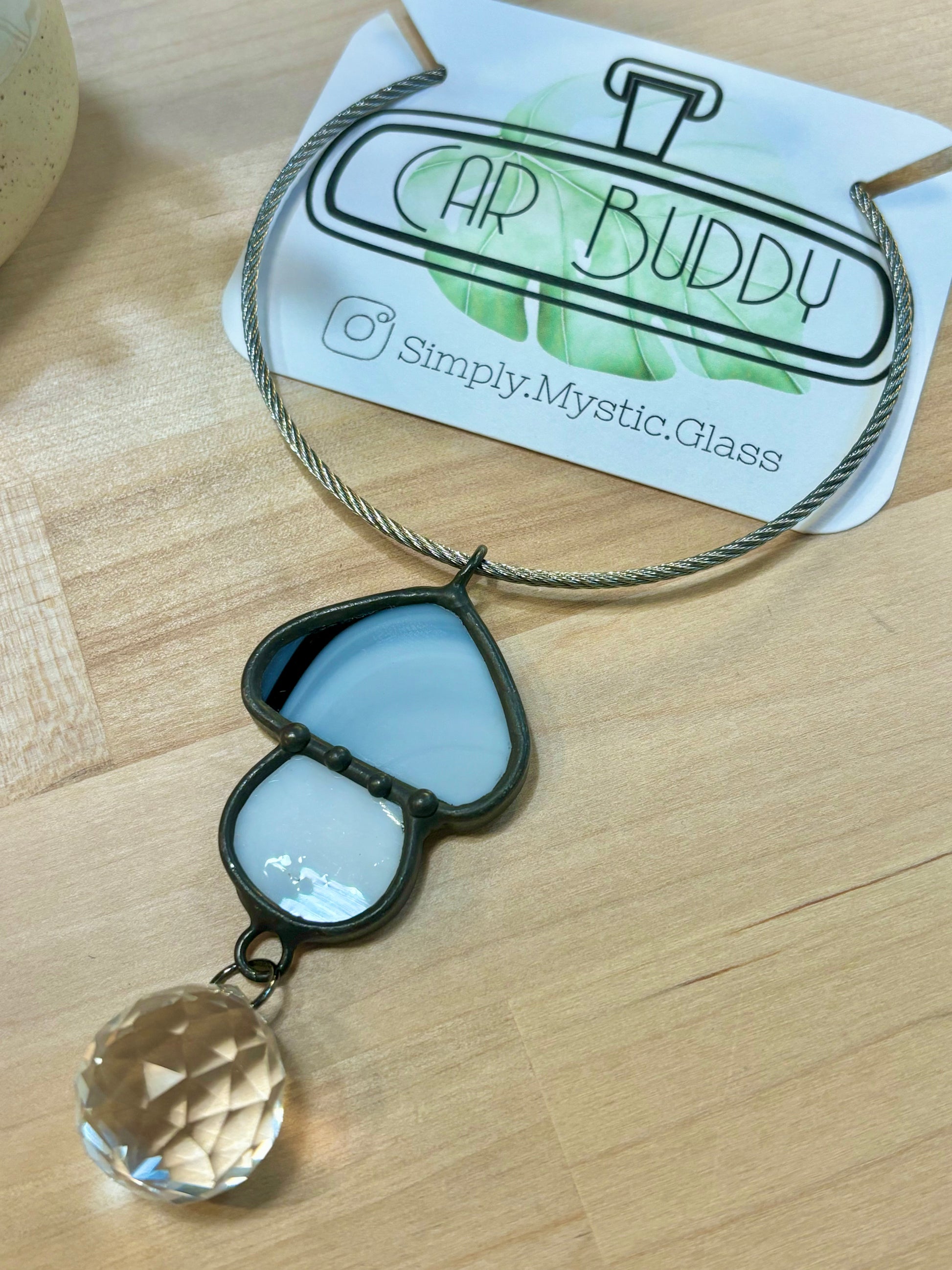 Enjoy stained glass even in your car! Just untwist the cable, wrap around your cars rear view mirror and secure the cable. Now you have a beautiful stained glass piece and a glass crystal in your car.